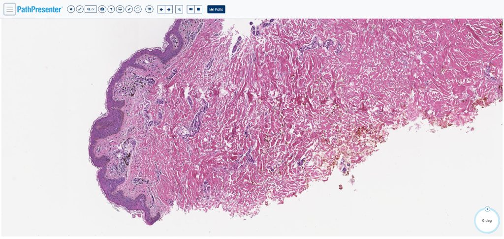 Test yourself with this gold-standard dermatopathology case, curated by leading specialists with decades of experience (including our own Rajendra Singh MD). Check the history, scrutinize the interactive WSI with our viewer, and make your diagnosis. Can you get it? Good luck!
