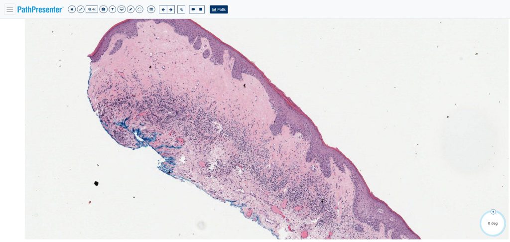 Test yourself with this gold-standard dermatopathology case, curated by leading specialists with decades of experience (including our own Rajendra Singh MD). Check the history, scrutinize the interactive WSI with our viewer, and make your diagnosis. Can you get it? Good luck!