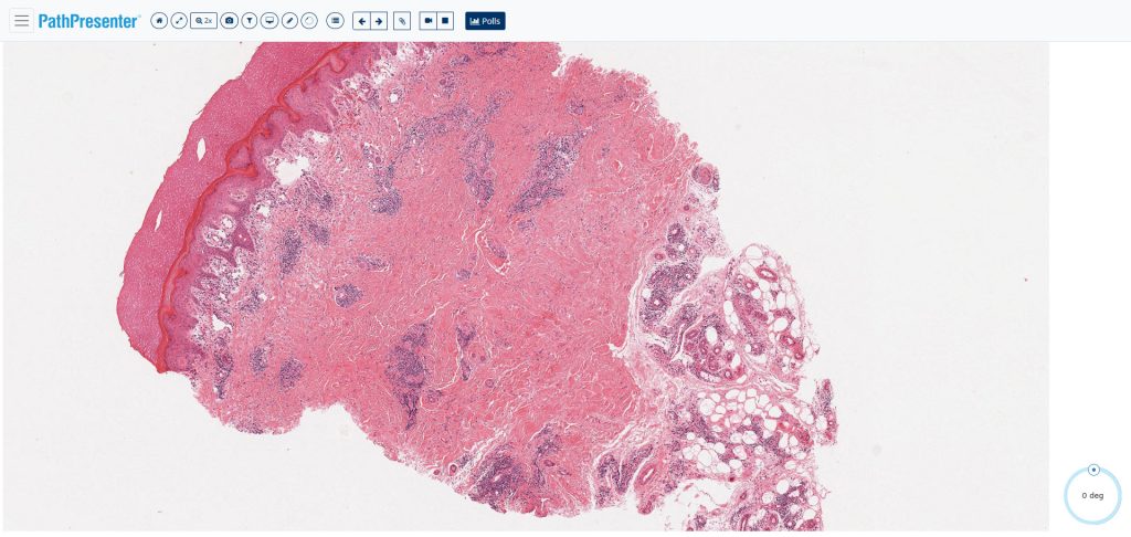 Test yourself with this gold-standard dermatopathology case, curated by leading specialists with decades of experience (including our own Rajendra Singh MD). Check the history, scrutinize the interactive WSI with our viewer, and make your diagnosis. Can you get it? Good luck!